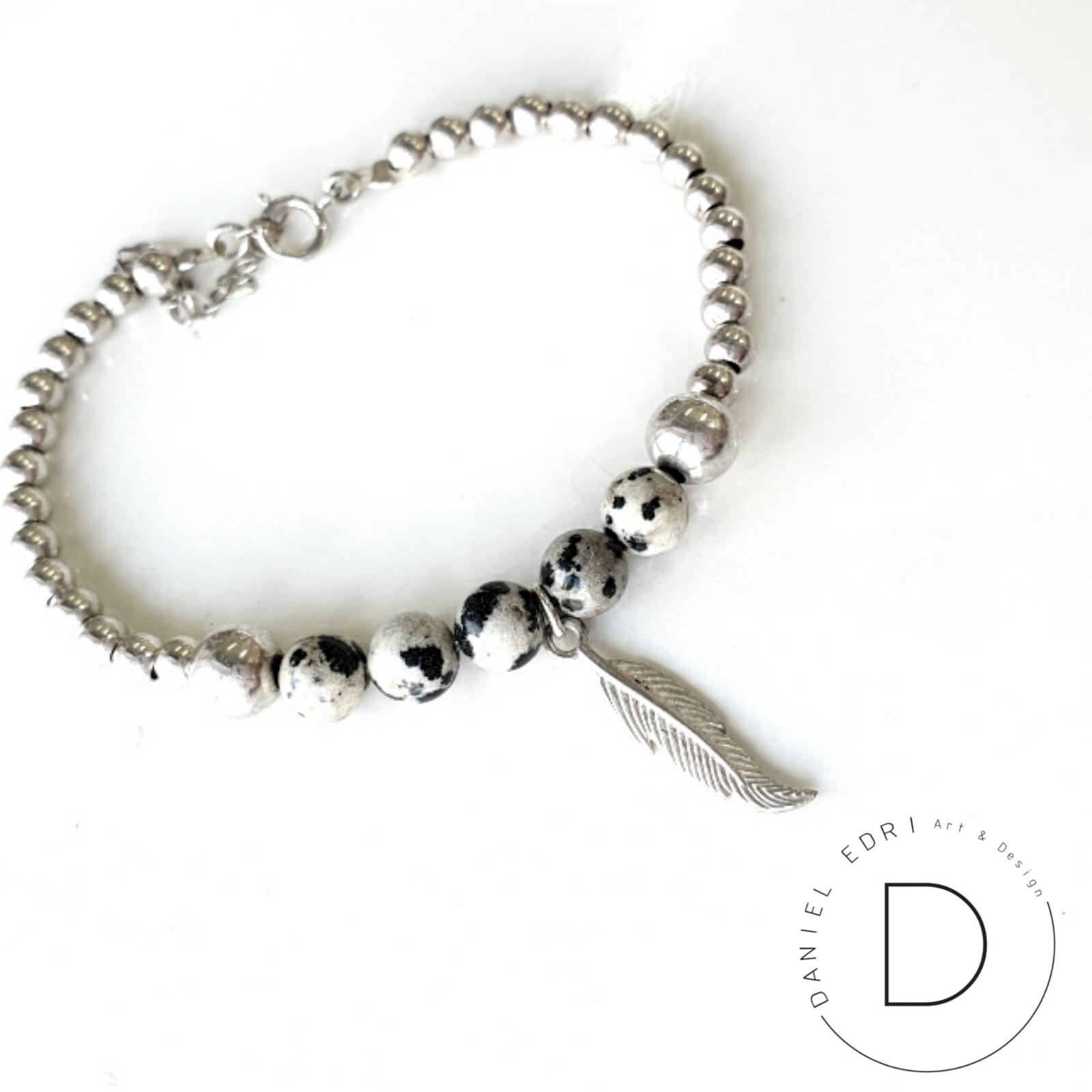 צמיד חרוזים מאבנים טבעיות בגוון חום אפור מנוקד.